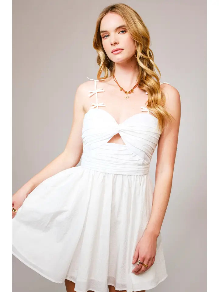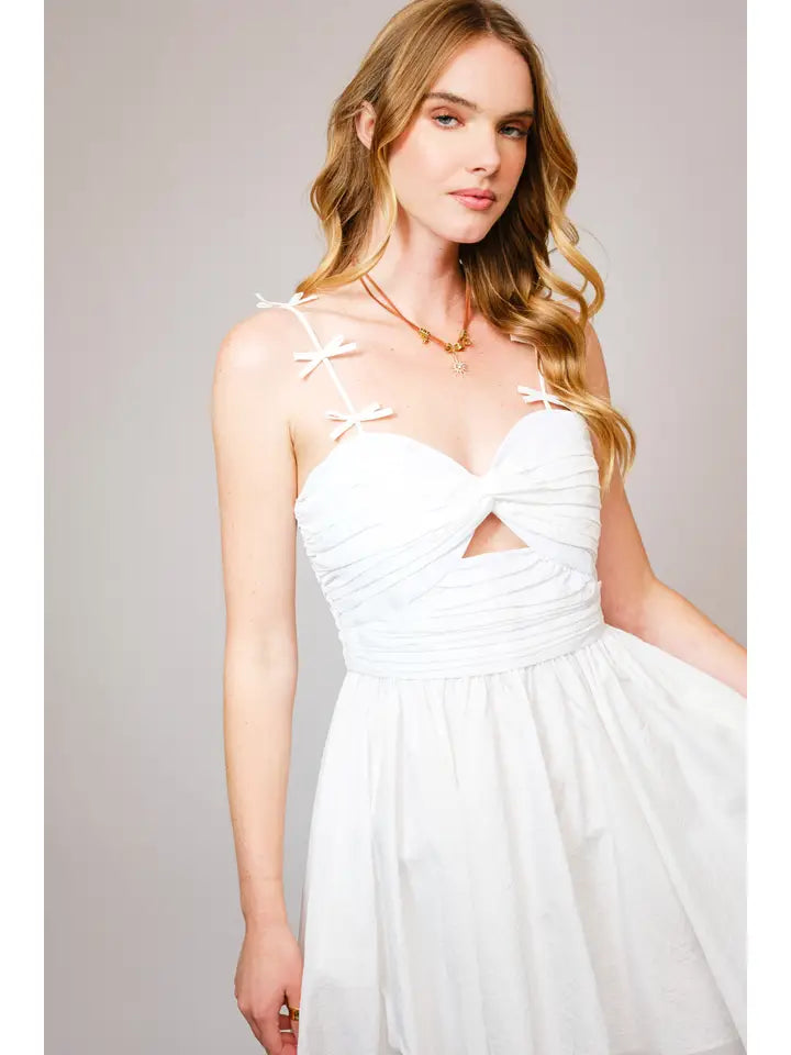 Designed with sweet bow-tie straps, a flattering ruched bodice, and a flirtatious front cutout, it’s your go-to dress for summer soirées, brunch dates, or weekend escapes.