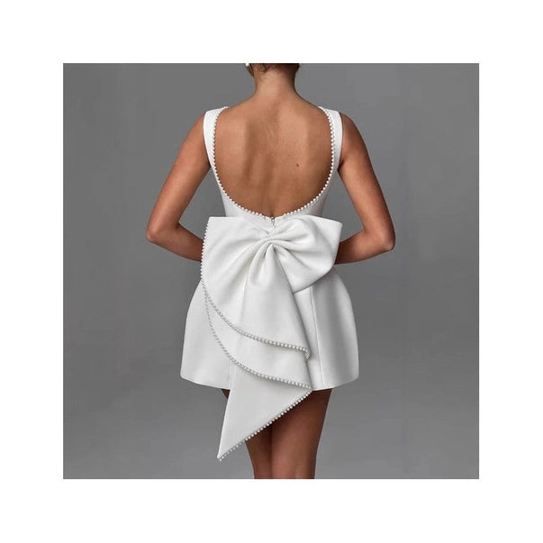 The Camille Bow-Back Mini Dress is elegance with a wink. Sculpted in pristine white with pearl-trimmed edges and a dramatic oversized bow, it blends vintage glamour with a playful twist.
